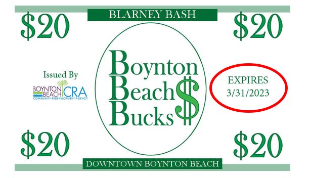 Visit the BBCRA information booth at the Boynton Beach Blarney Bash on Saturday March 11, 2023, between the hours of 4:00 PM and 9:00 PM to collect your Boynton Beach Bucks vouchers. Vouchers are limited and will be distributed on a first-come, first-serve basis.