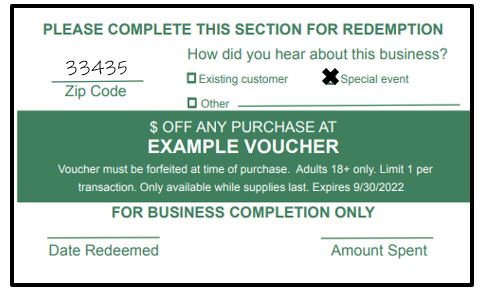 Complete the top portion of the voucher as pictured below. Forfeit your voucher when paying at the participating business.